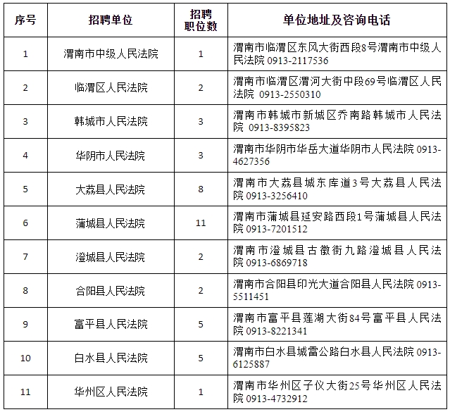 全市法院共招聘聘用制書記員43名,各法院招聘職位、地址及政策咨詢電話詳見《渭南法院2023年面向社會公開招聘聘用制書記員職位表》(附件)。