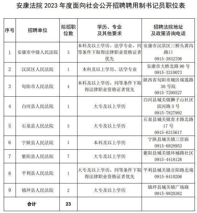 7.招聘崗位所需的其他具體條件及職位以《安康法院2023年度面向社會(huì)公開招聘聘用制書記員職位表》公布為準(zhǔn);