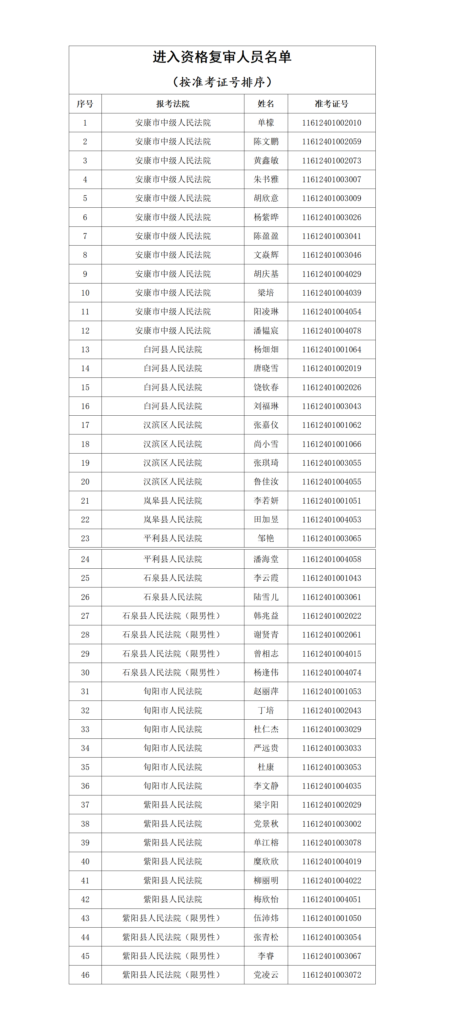資格復(fù)審工作結(jié)束3日內(nèi),進(jìn)入面試人員名單在安康市中級(jí)人民法院及陜西秦潤人力資源集團(tuán)有限公司官網(wǎng)和微信公眾號(hào)上進(jìn)行公布。